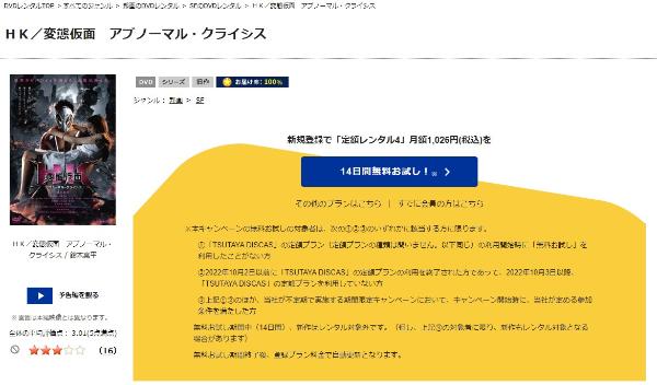 そして、映画「HK 変態仮面 アブノーマル・クライシス」はツタヤディスカスで配信しているので、無料でDVDレンタルが可能です。