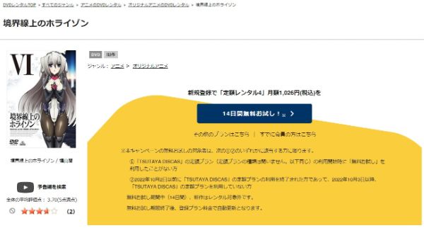TSUTAYA DISCASは、準新作は8枚まで、話題作・旧作は枚数制限なしでお試し期間中に無料レンタルができ「境界線上のホライゾン」のアニメは、旧作なので無料視聴可能です。
