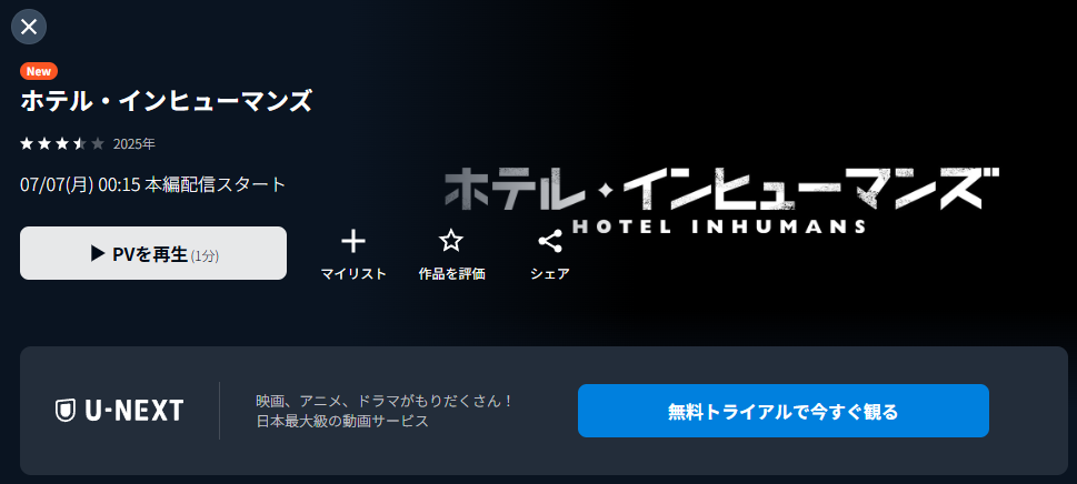 先に結論をお伝えすると、アニメ「ホテル・インヒューマンズ」は、『U-NEXT』の動画配信サイトで配信中のため無料トライアル期間中に全話視聴が可能です。
