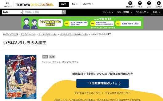 TSUTAYA DISCASは、準新作は8枚まで、話題作・旧作は枚数制限なしでお試し期間中に無料レンタルができ「いちばんうしろの大魔王」のアニメは、旧作なので無料視聴可能です。