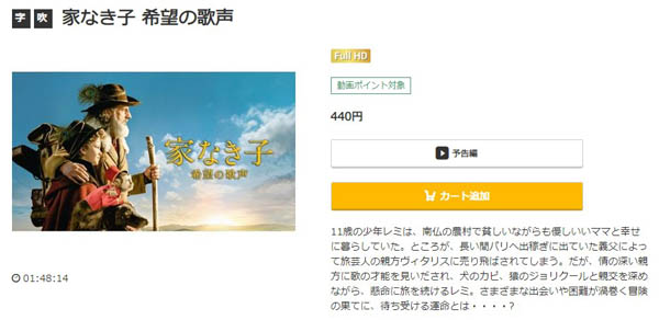 music.jpは、初回登録で1,600Ptが貰えるので「家なき子 希望の歌声」の映画を無料で見ることができます。