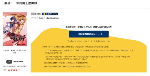 TSUTAYA DISCASは、準新作は8枚まで、話題作・旧作は枚数制限なしでお試し期間中に無料レンタルができ「一騎当千 集鍔闘士血風録」のアニメは、旧作なので無料視聴可能です。
