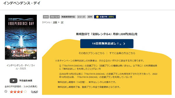 そして、映画「インデペンデンス・デイ」はツタヤディスカスで配信しているので、無料でDVDレンタルが可能です。