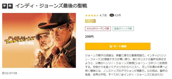 映画「インディ・ジョーンズ 最後の聖戦」は299円でレンタル配信してるので、フルで視聴できます。