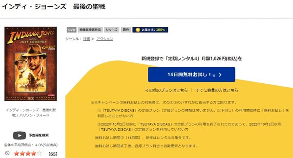 そして、映画「インディ・ジョーンズ 最後の聖戦」はツタヤディスカスで配信しているので、無料でDVDレンタルが可能です。