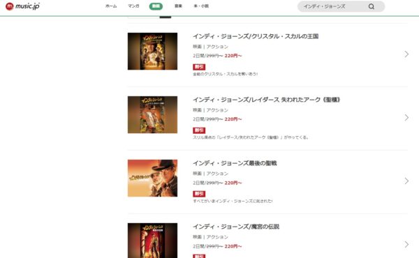 music.jpでの洋画「インディ・ジョーンズ」シリーズの配信状況は以下になります。