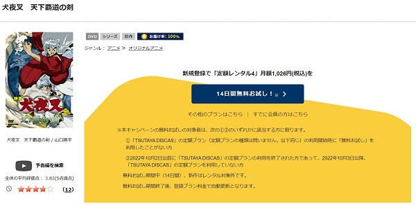 そして、映画「犬夜叉 天下覇道の剣」はツタヤディスカスで配信しているので、無料でDVDレンタルが可能です。