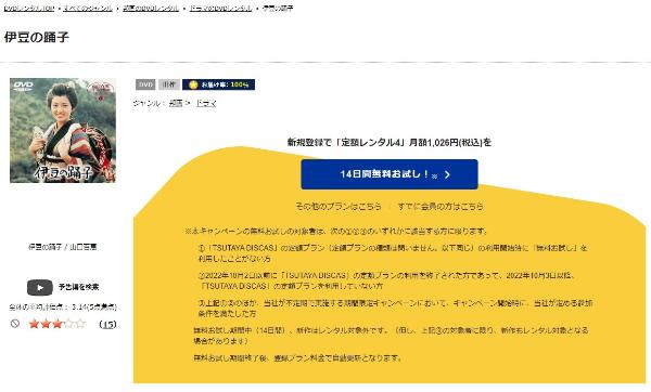 そして、映画「伊豆の踊子 1974年」はツタヤディスカスで配信しているので、無料でDVDレンタルが可能です。