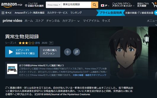 人気の動画配信サイトAmazonプライムでも、アニメ「異常生物見聞録」を視聴できるか調査しました。