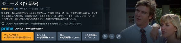 Amazonプライムビデオは、30日間のお試し無料期間があり「ジョーズ3」の映画をフルで視聴することができます。