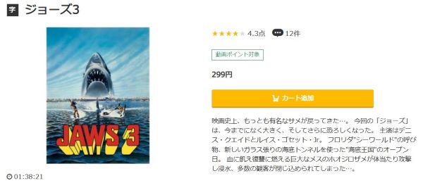 映画「ジョーズ3」は299円でレンタル配信してるので、フルで視聴できます。
