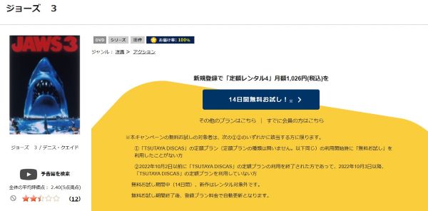 そして、映画「ジョーズ3」はツタヤディスカスで配信しているので、無料でDVDレンタルが可能です。
