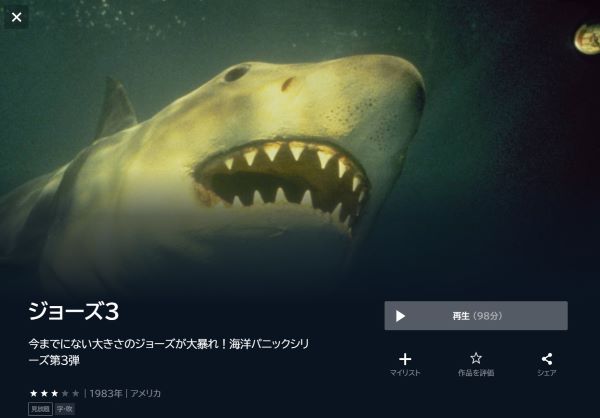 ただ、映画「ジョーズ3」の関連作品の映画は配信しているので、見放題で視聴は可能です。