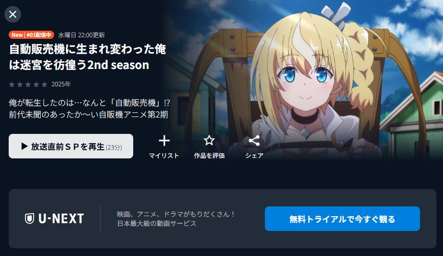 アニメ「自動販売機に生まれ変わった俺は迷宮を彷徨う 2nd season」は、U-NEXTで配信中のため、配信開始後無料トライアル中に見放題で全話視聴ができます。