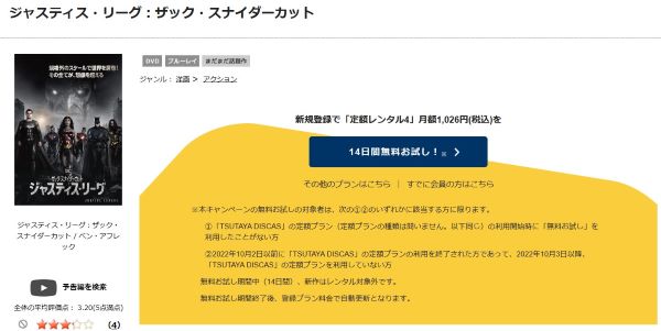 そして、映画「ジャスティス・リーグ:ザック・スナイダーカット」はツタヤディスカスで配信しているので、無料でDVDレンタルが可能です。
