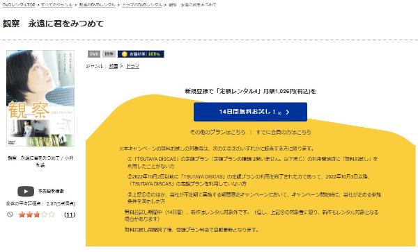 そして、映画「観察 ~永遠に君をみつめて~」はツタヤディスカスで配信しているので、無料でDVDレンタルが可能です。
