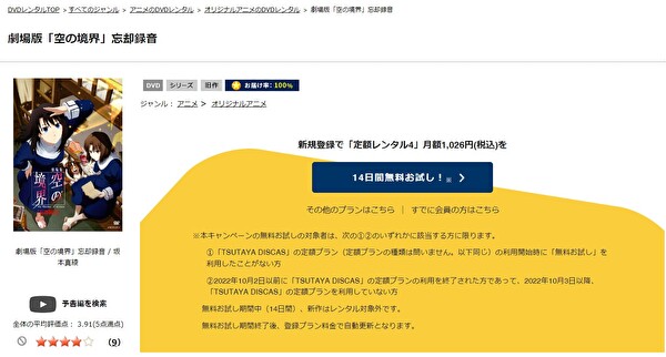 TSUTAYA DISCASの定額4プランは、準新作・話題作・旧作は4枚までお試し期間中に無料レンタルができるので、「劇場版「空の境界」第六章 忘却録音」の関連作品の映画を無料視聴した後もお試し期間中なら他の映画も無料でレンタルすることができますよ。