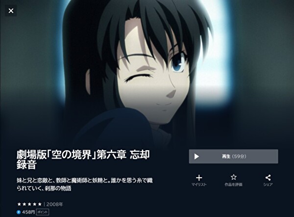 ただ、映画「劇場版「空の境界」第六章 忘却録音」の関連作品の映画も配信しているので、有料にはなりますが見放題で視聴は可能です。