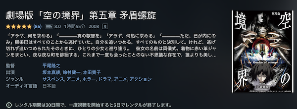 理由は、31日間の無料期間があり、「劇場版「空の境界」第五章 矛盾螺旋」の映画をフルで配信しているからになります。