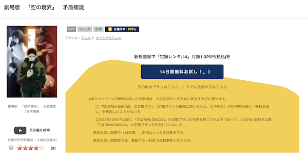 TSUTAYA DISCASの定額4プランは、準新作・話題作・旧作は4枚までお試し期間中に無料レンタルができるので、「劇場版「空の境界」第五章 矛盾螺旋」の関連作品の映画を無料視聴した後もお試し期間中なら他の映画も無料でレンタルすることができますよ。