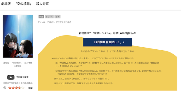TSUTAYA DISCASの定額4プランは、準新作・話題作・旧作は4枚までお試し期間中に無料レンタルができるので、「劇場版「空の境界」第二章 殺人考察(前)」の関連作品の映画を無料視聴した後もお試し期間中なら他の映画も無料でレンタルすることができますよ。