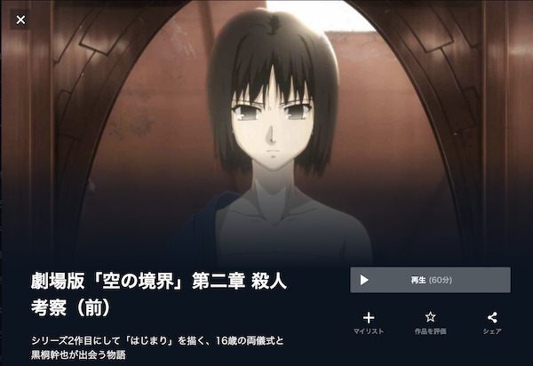 ただ、映画「劇場版「空の境界」第二章 殺人考察(前)」の関連作品の映画も配信しているので、有料にはなりますが見放題で視聴は可能です。