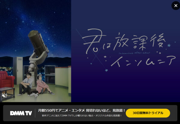 『DMMTV』は初回登録で、30日間のお試し期間があるのでアニメ「君は放課後インソムニア」をお試しで全話視聴することができますよ。