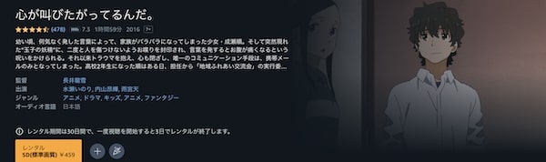 しかし、Amazonプライムビデオは無料期間が30日間ありますが、「心が叫びたがってるんだ。」の映画はレンタル作品で459円かかってしまうため無料視聴することができません。