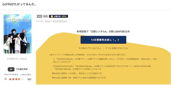 ツタヤディスカスは、準新作・話題作・旧作が4枚までなら、無料お試し期間中にレンタルができるので、「心が叫びたがってるんだ。」の映画を無料で視聴した後も14日間以内なら他のシリーズ作品や見たかった映画も無料でレンタルすることができますよ。