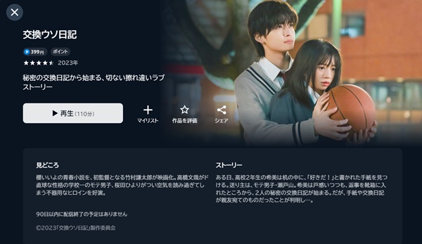 映画「交換ウソ日記」をU-NEXTで視聴するのに399円のレンタル料金がかかります。
