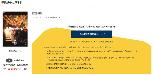 TSUTAYA DISCASは、準新作は8枚まで、話題作・旧作は枚数制限なしでお試し期間中に無料レンタルができ「甲鉄城のカバネリ」のアニメは、旧作なので無料視聴可能です。