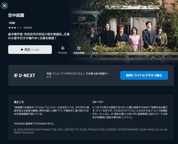 U-NEXTなら無料期間中のお試し期間内であれば、すぐに映画「空中庭園」の動画をフルで無料視聴することが出来ます。
