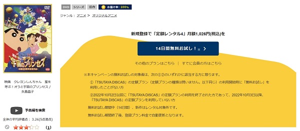 TSUTAYA DISCASの定額4プランは、準新作・話題作・旧作は4枚までお試し期間中に無料レンタルができるので、「クレヨンしんちゃん 嵐を呼ぶ!オラと宇宙のプリンセス」の関連作品の映画を無料視聴した後もお試し期間中なら他の映画も無料でレンタルすることができますよ。