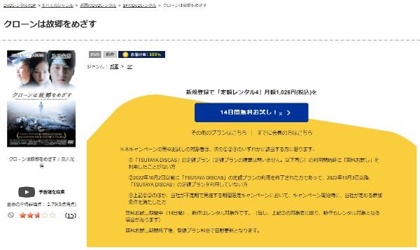 そして、映画「クローンは故郷をめざす」はツタヤディスカスで配信しているので、無料でDVDレンタルが可能です。