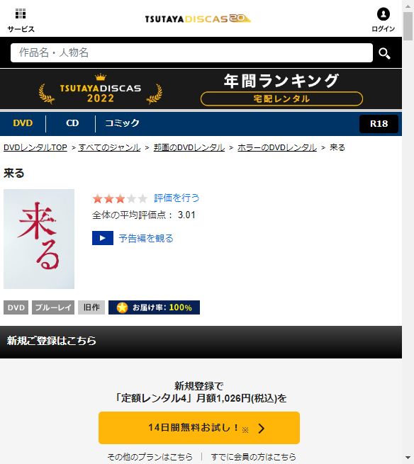 TSUTAYA DISCASで映画「来る」をDVDレンタルで無料視聴