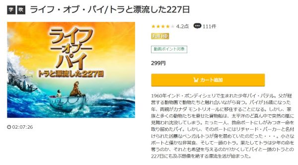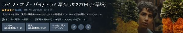 映画「ライフ・オブ・パイ/トラと漂流した227日」は299円でレンタル配信してるので、フルで視聴できます。