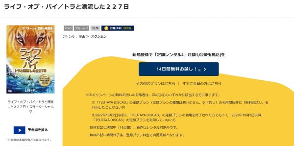 そして、映画「ライフ・オブ・パイ/トラと漂流した227日」はツタヤディスカスで配信しているので、無料でDVDレンタルが可能です。