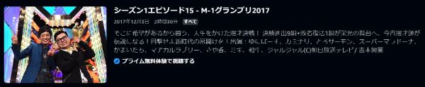 Amazonプライムは、初回30日間の無料期間があり、バラエティ番組「M-1グランプリ2017漫才師が4分間で「とにかく面白い漫才」を披露するM-1グランプリの2017年大会2017年」は見放題になっているので、全話視聴ができます。