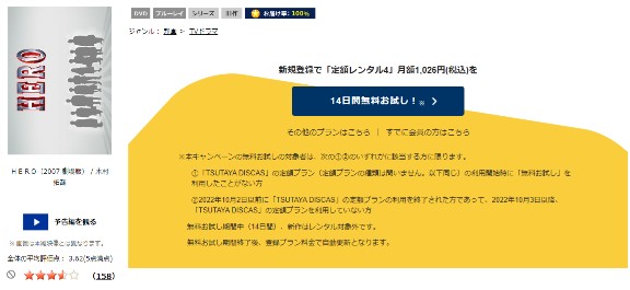 そして、映画「劇場版 HERO(2007)」はツタヤディスカスで配信しているので、無料でDVDレンタルが可能です。