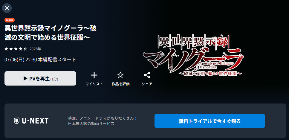 アニメ「異世界黙示録マイノグーラ~破滅の文明で始める世界征服~」は、U-NEXTで配信中のため、配信開始後無料トライアル中に見放題で全話視聴ができます。