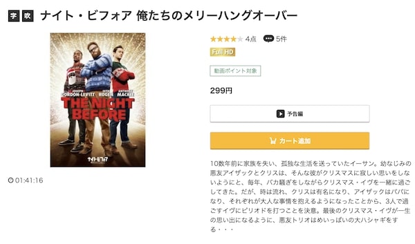 music.jpは、初回登録で1,600Ptが貰えるので「ナイト・ビフォア 俺たちのメリーハングオーバー」の映画を無料で見ることができます。