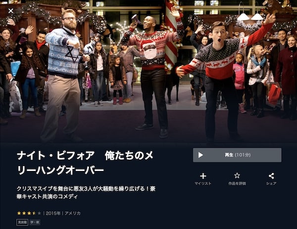 ただ、映画「ナイト・ビフォア 俺たちのメリーハングオーバー」の関連作品の映画は配信しているので、見放題で視聴は可能です。