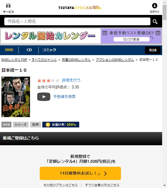 ツタヤディスカスは、準新作・話題作・旧作が4枚までなら、無料お試し期間中にレンタルができるので、「日本統一10」の映画を無料で視聴した後も14日間以内なら他のシリーズ作品や見たかった映画も無料でレンタルすることができますよ。