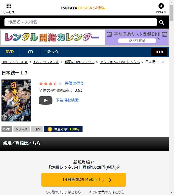 そして、映画「日本統一13」はツタヤディスカスで配信しているので、無料でDVDレンタルが可能です。