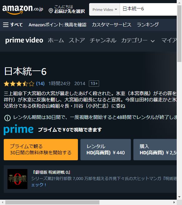 Amazonプライムビデオは、30日間のお試し無料期間があり「日本統一6」の映画をフルで視聴することができます。