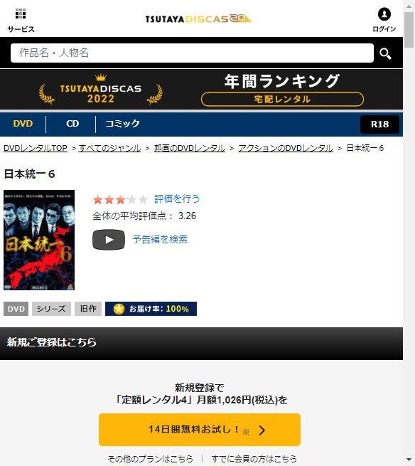 そして、映画「日本統一6」はツタヤディスカスで配信しているので、無料でDVDレンタルが可能です。