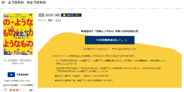 ツタヤディスカスは、準新作・話題作・旧作が4枚までなら、無料お試し期間中にレンタルができるので、「の・ようなもの のようなもの」の映画を無料で視聴した後も14日間以内なら他のシリーズ作品や見たかった映画も無料でレンタルすることができますよ。