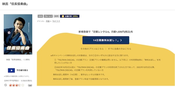 そして、映画「信長協奏曲 NOBUNAGA CONCERTO」はツタヤディスカスで配信しているので、無料でDVDレンタルが可能です。