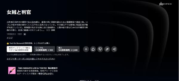 しかし、映画「女賊と判官」はレンタル作品のため、500円かかってしまい無料視聴することができません。