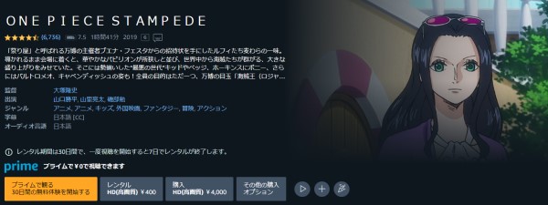 Amazonプライムビデオのお試し期間は、30日間で「ONE PIECE STAMPEDE」の映画は見放題なので無料視聴が可能です。
